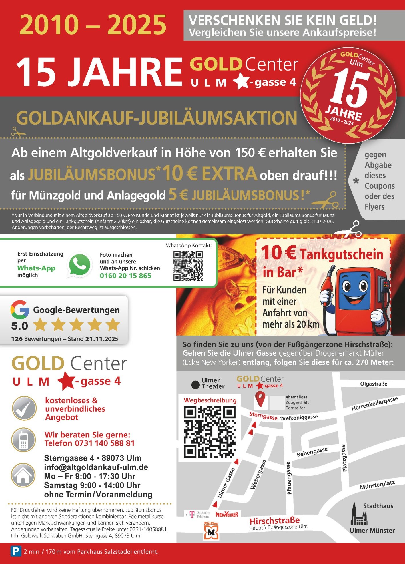 Wir sind das Gold Center Ulm, ein unabhängiges, inhabergeführtes Fachgeschäft im Herzen von Ulm. Seit vielen Jahren stehen wir für fairen Goldankauf, präzise Edelmetallbewertung und transparente Beratung – stets persönlich, seriös und auf höchstem Niveau.